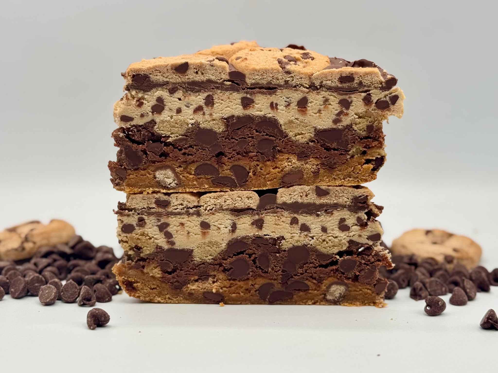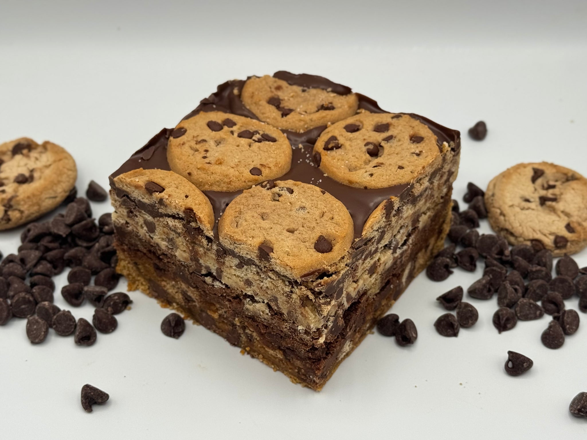 First we start with a pumpkin chocolate chip cookie base with Chips Ahoy chunks and chocolate covered cookie dough bites. There is a layer of pumpkin butter followed with a chocolate brownie layer with chocolate chip cookie chunks mixed throughout. The next layer is an edible chocolate chip cookie dough that is coated with milk chocolate and more Chips Ahoy cookies.