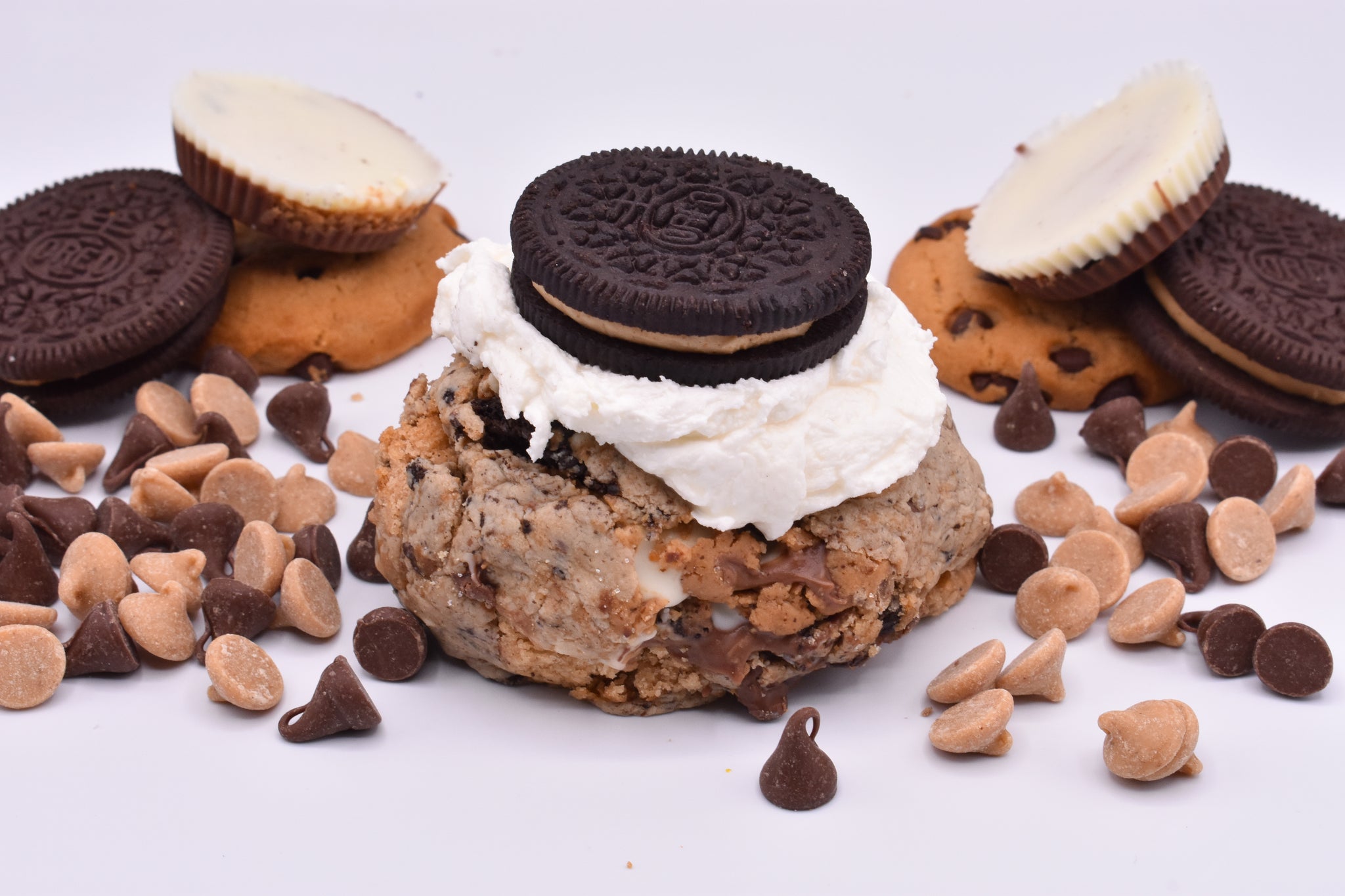 This is a cookies and cream cookie base that's loaded with milk chocolate chips, peanut butter chips, cookies & cream bars, Oreo Reese cups, peanut butter Oreos, and Chips Ahoy cookies. It's filled with ADNB Chip Wrecked Peanut Butter. The cookie is topped a peanut butter Oreo smushed into a marshmallow cream.