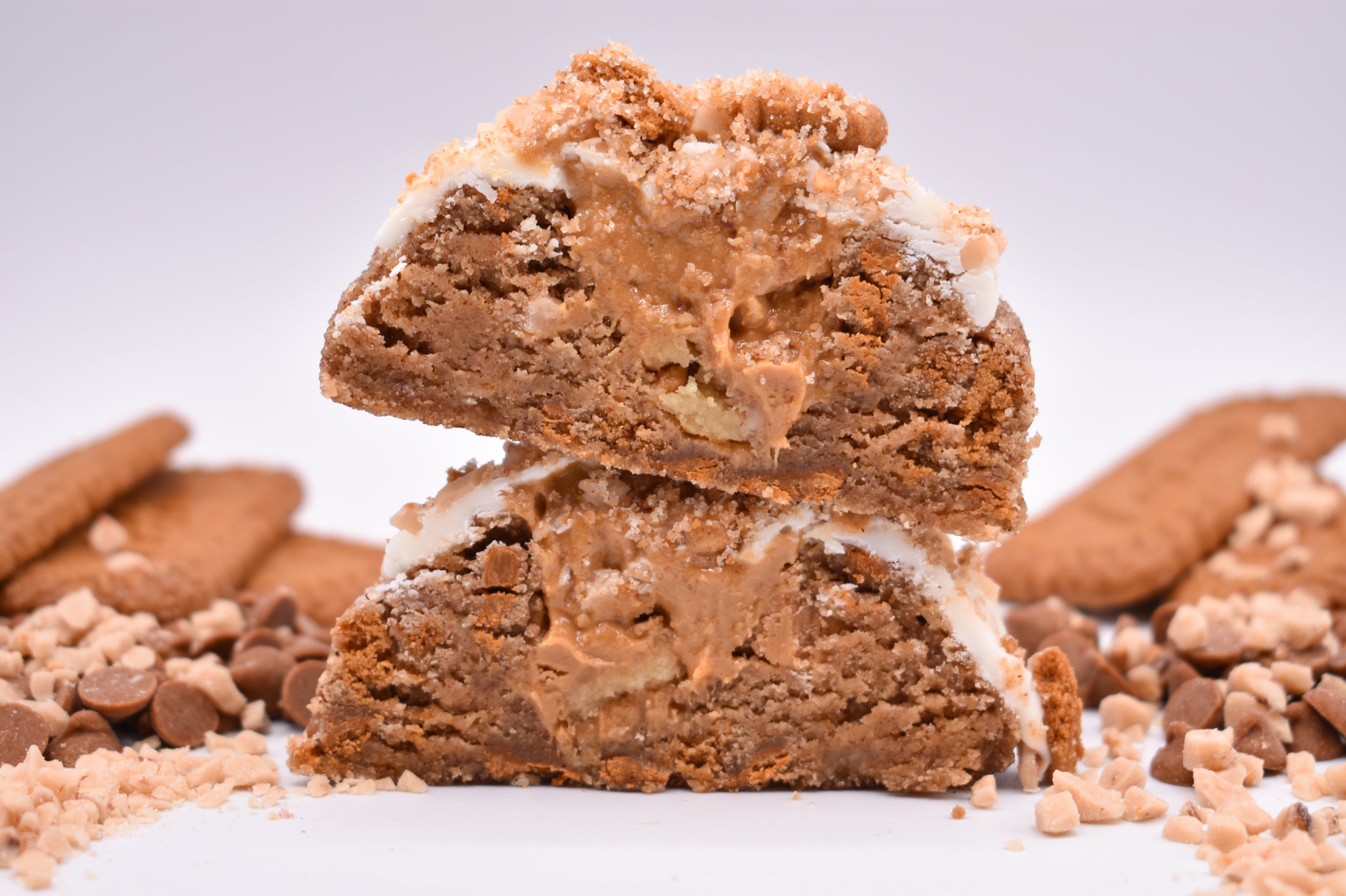 This is a snickerdoodle cookie that's loaded with cinnamon chips, toffee bits, and Biscoff cookie chunks. It's filled with ADNB Cookie Butter Toffee Crunch Peanut Butter. The cookie is topped with white chocolate, more toffee bits, and a homemade cinnamon sugar cookie crunch.